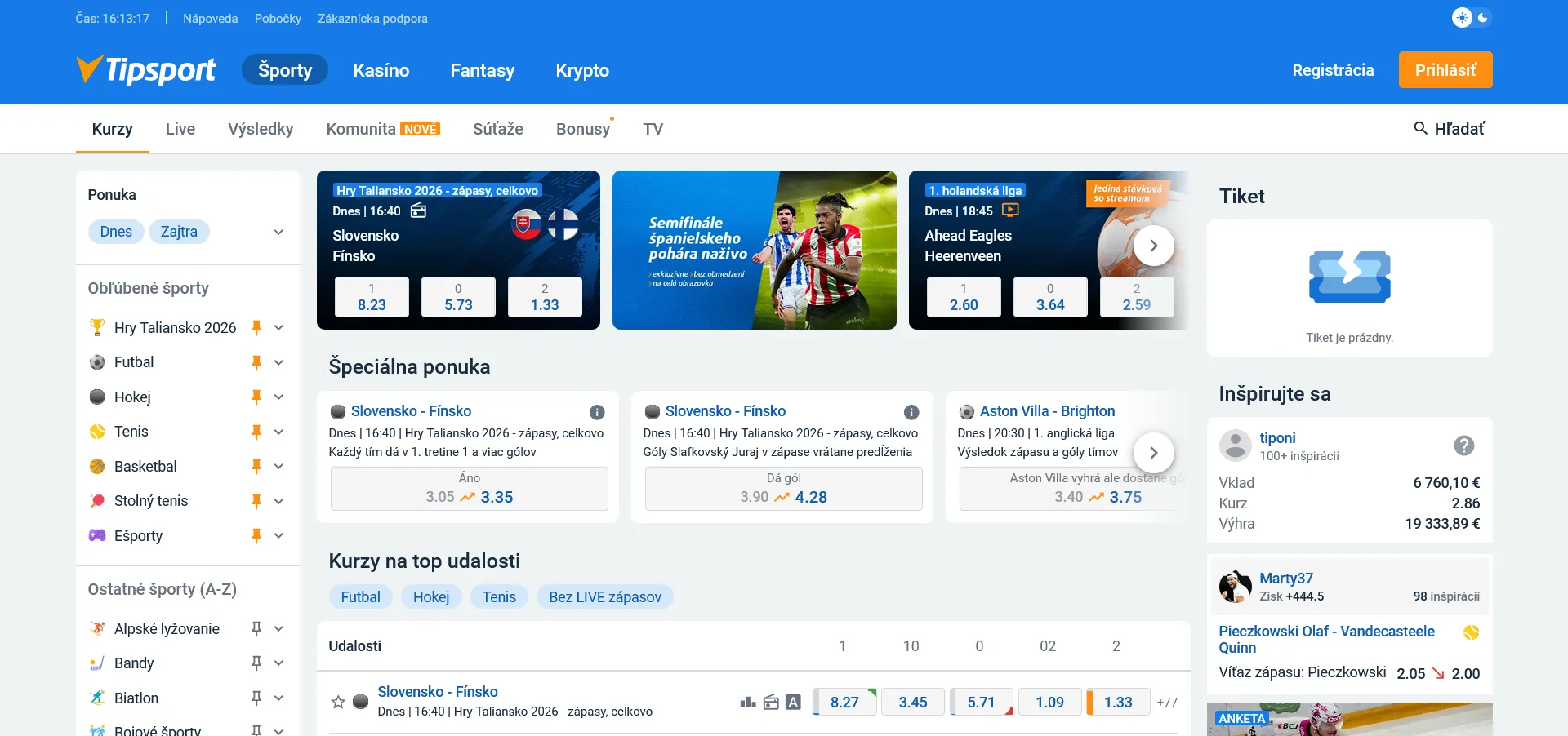 - Tipsport: Tipsport je aktuální lídr v oblasti komunitního sázení a livestreamů. Jeho platforma je oceňována pro nejširší nabídku sportovních přenosů (Tipsport TV) a propracované fórum, kde můžete o sázkách diskutovat s ostatními.